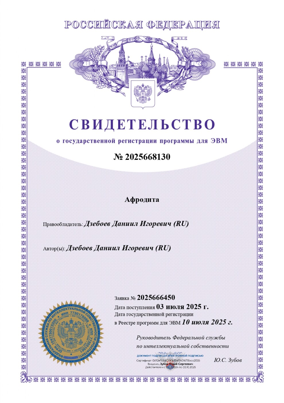Номер регистрации (свидетельства): Дата регистрации: 10.07.2025 Номер и дата поступления заявки: Дата публикации и номер бюллетеня: 10.07.2025 Бюл. № 7 Контактные реквизиты: | Автор: Правообладатель: |