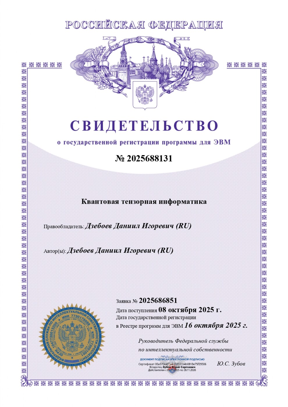Программа открывает возможность представления на квантовых компьютерах многомерных данных из реального мира и их эффективной обработки с учётом особенностей квантового хранения и операций над информацией. Программа предназначена для работы с тензорными структурами, возникающими в задачах искусственного интеллекта, компьютерного зрения, видеоанализа и генерации изображений. В основе лежит идея квантового тензорного произведения, при котором данные не сворачиваются в одномерный вектор амплитуд, а сохраняют собственные измерения в виде запутанных кубитов. Такое представление позволяет естественным образом учитывать пространственные, временные и семантические зависимости между компонентами данных. Программа создаёт и инициализирует квантовые состояния, соответствующие этим структурам, обеспечивая базу для дальнейших вычислений и моделирования в средах Qiskit и других квантовых платформах. Тип ЭВМ: Квантовый компьютер; ОС: Qiskit Runtime Environment, IBM Quantum Experience, Linux (Aer Simulator).